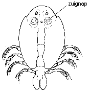 | 35 | Het dier leeft op het oppervlaktelaagje van het water en springt hoog op als het verstoord wordt. Het gebruikt daarvoor een vorkachtige staart, die onder het lichaam geklapt ligt. Meestal klein, ± 1 mm. Orde Colembola, springstaartjes | |  |